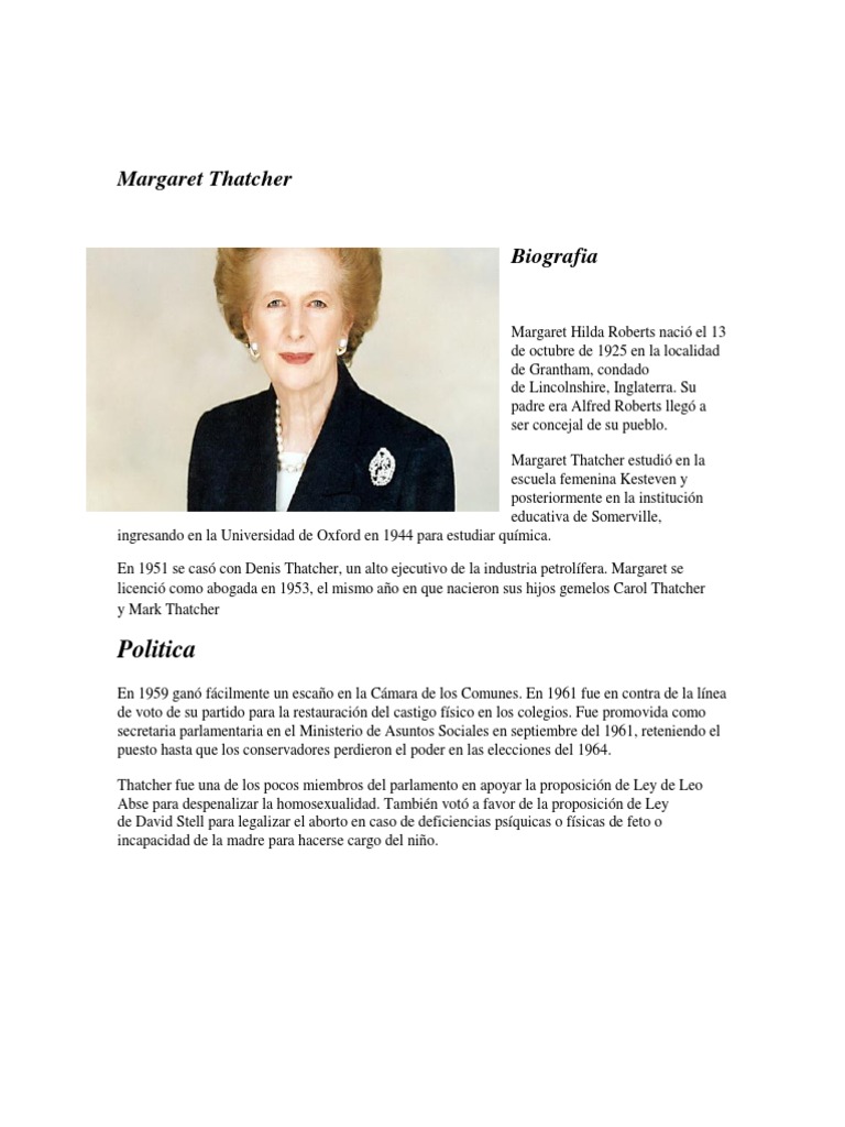 Biografia de margaret thatcher resumida o Toda Matria Biografias Margaret Thatcher 1925-2013 foi primeira-ministra britnica e a primeira mulher a ocupar este posto. Margaret Thatcher Margaret Thatcher naci el 13 de octubre de 1925 en Grantham Inglaterra Reino Unido. Do what you think.